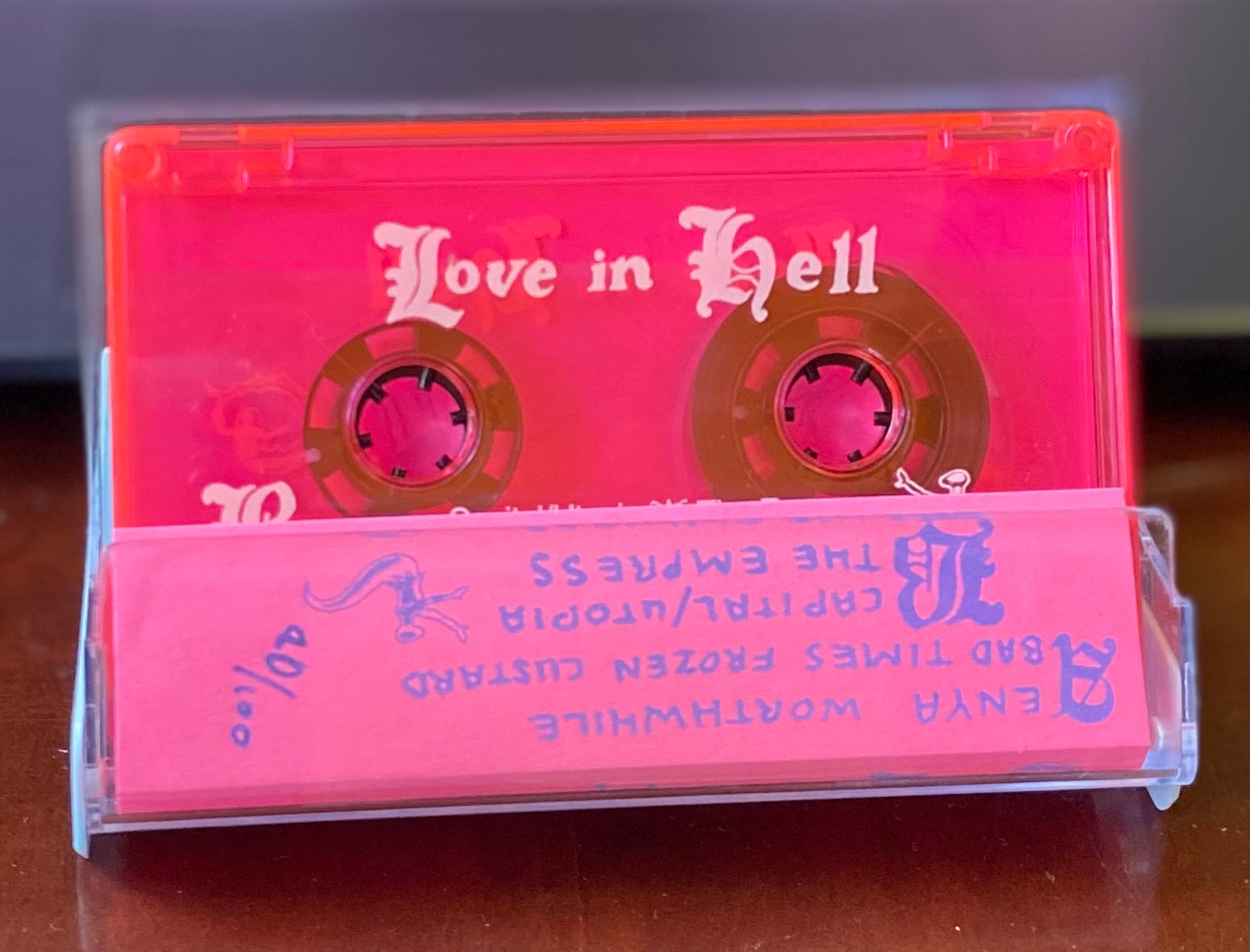 Hot pink cassette tape with charming original cover art by Rose Lewis